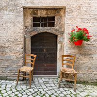 Stoeltjes met een (kapotte) rieten zitting voor een oude deur en een uniek bewerkt kozijn in het bergdorpje Santo Stefano di Sessanio in de Italiaanse Abruzzen.