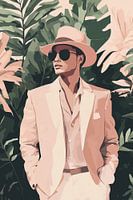In deze sprankelende afbeelding zien we een man die moeiteloos stijl en zelfvertrouwen uitstraalt. Hij staat rechtop met zijn handen nonchalant in zijn zakken, wat een ontspannen en tegelijk stoere houding benadrukt. Zijn outfit bestaat uit een lichtroze pak, dat perfect aansluit bij de zomerse sfeer en zijn uitgesproken persoonlijkheid. De combinatie van de zachte tinten met de scherpe snit van het pak voegt een vleugje elegantie toe aan zijn stoere uitstraling.