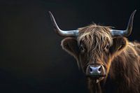 Deze indrukwekkende foto vangt de krachtige blik van een Schotse Hooglander in een diep contrast met de donkere achtergrond. De wilde, warrige vacht en de scherpe hoorns geven een robuust karakter weer, dat symbool staat voor puurheid en natuurkracht. Een stuk dat perfect past in een modern of industrieel interieur, waar het rust en kracht uitstraalt. Deze foto is niet zomaar een afbeelding van een dier, het is een venster naar de ongerepte natuur, vastgelegd met oog voor detail en authenticiteit. Een statement voor aan de muur, ideaal voor iedereen die een vleugje wilde natuur in huis wil halen.