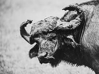 Deze stoere waterbuffel heeft zojuist een modderbad genomen. Nog even kijkt de buffel met het moddermasker om. Deze zwart-wit foto is genomen in Masai Mara, Kenia.