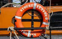 De oranje reddingsboei contrasteert fraai met de bruinoranje romp van de authentieke Zuid-Hollandse paviljoentjalk uit 1905— De Stoere Eenvoud. Hier komt stoer vakmanschap samen met eenvoud.
