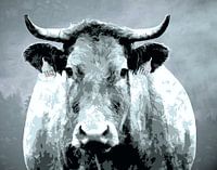 Koe met horens geschilderd in zeegroen, grijs, lichtblauw en gebroken wit tegen een wazige, vage achtergrond.