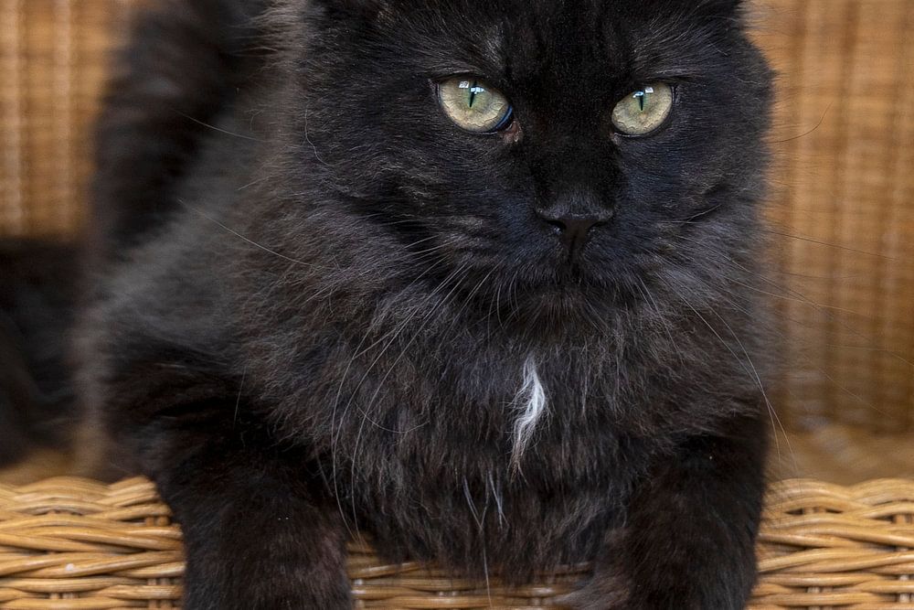 Stoere meid! Zwarte maine coon ligt op een rieten stoel. Deze stoere meid is nog een jonge maine coon, ze heeft een mooie blik en een leuk wit plukje op haar borst.