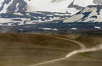 Een auto rijdt over de oververharder weg van de route "Kjolur" door het binnenland van IJsland. Achter zich het stof en de hoge bergen van IJsland.