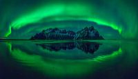 Aurora reflections on Stokksnes black beach with Vestrahorn mountains in center, Iceland