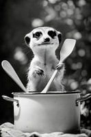 In een charmant, humoristisch moment zit een schattig stokstaartje in een pot te spelen met twee houten lepels. Zijn grote, nieuwsgierige ogen stralen verrukking uit en geven het tafereel een speels tintje. Dit grappige kunstwerk verandert elke keuken in een plek van levendige creativiteit en creëert een vrolijke sfeer tijdens het koken.