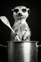 Op een humoristisch moment staat een nieuwsgierige stokstaartkok met een menglepel in zijn hand, klaar om een heerlijke verrassing te bereiden. De zwart-wit afbeelding straalt een charmant, speels karakter uit. Perfect voor in de keuken, het voegt een vrolijke noot toe en inspireert tot koken!