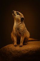 Een stokstaartje staat rechtop op zijn uitkijkpost, badend in zacht, warm studiolicht.