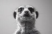 Op de zwart-wit foto staat een alerte stokstaartje tegen een lichte achtergrond. Zijn grote, donkere ogen kijken nieuwsgierig en waakzaam in de lens, omringd door fijne, donkere vacht die scherp afsteekt tegen zijn lichtere lichaam. De subtiele details van zijn vacht en de delicate lijnen van zijn snorharen worden prachtig benadrukt.…