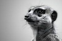 Op de zwart-wit foto staat een alerte stokstaartje tegen een lichte achtergrond. Zijn grote, donkere ogen kijken nieuwsgierig en waakzaam in de lens, omringd door fijne, donkere vacht die scherp afsteekt tegen zijn lichtere lichaam. De subtiele details van zijn vacht en de delicate lijnen van zijn snorharen worden prachtig benadrukt. Zijn kleine, fijne klauwen rusten op de grond terwijl hij rechtop staat, met zijn lange staart elegant naar beneden gebogen. De lichte doek achter hem laat het silhouet van het stokstaartje duidelijk naar voren komen, waardoor zijn innemende en speelse karakter nog beter uit de verf komt.