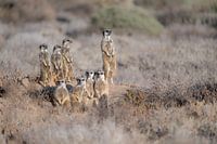 Koop de foto Stokstaartjes warmen zich op bij de opkomende zon van Lex van Doorn op canvas, aluminium dibond, (ingelijste) fotoprint, behang en ArtFrame, op maat geprint in Fine-Art kwaliteit.
