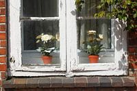 Oud raam met bloempotten in Stolbergstraße, Eutin, Sleeswijk-Holstein, Duitsland, Europa