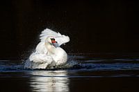 Een knobbelzwaan (Cygnus olor) maakt zichzelf schoon in water op een meer in het natuurreservaat Mönchbruch bij Frankfurt, Duitsland.