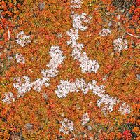 Een werk in roodbruine tinten, met een zweempje groen en met witte en roze accenten, gebaseerd op een foto van sedumplantjes (stonecrop in het Engels) die groeien op een oud en verweerd stuk asfalt.