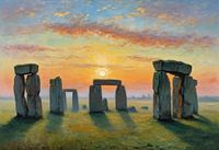 Tegen een weidse hemel van goud en violet komen de eeuwenoude stenen van Stonehenge tevoorschijn door middel van zachte, sfeervolle penseelstreken. De kunstenaar mengt licht en schaduw om de megalieten een levende aanwezigheid te geven, alsof ze zoemen met de echo's van eeuwen. De omringende graslanden rimpelen in getextureerd groen en nodigen uit tot contemplatie van mysterie, geschiedenis en de stille kracht van de natuur. Een fascinerend middelpunt voor liefhebbers van 's werelds wonderen uit de oudheid.