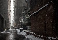 Een sneeuwbui tussen de gebouwen in het centrum van Chicago. Vage lampen, stoom en sneeuw aan de kant. Vuilnis en brandtrappen.