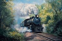 Een majestueuze stoomlocomotief verbreekt de stilte van de natuur tussen de groene boomtoppen en dampende dampen. Het glanzende zwart steekt fel af tegen het frisse groen, terwijl de opstijgende stoom mystiek de lucht in zweeft. De sporen vertellen verhalen uit een vervlogen tijd, toen reizen een avontuur was en elke reis een belevenis.
