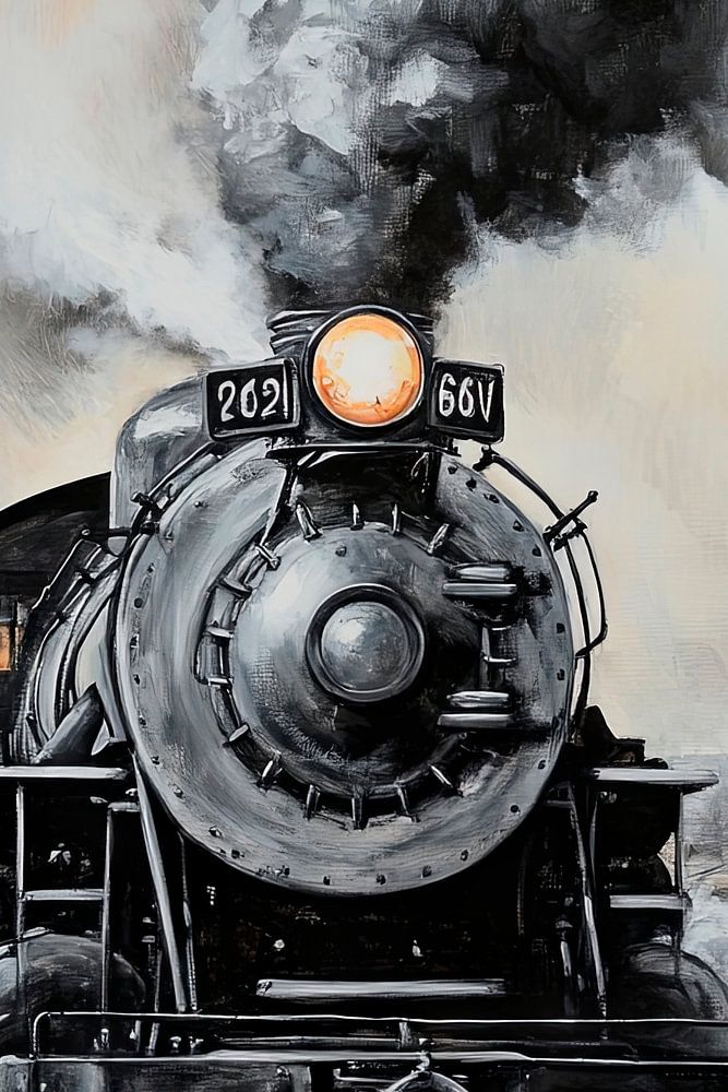 Een majestueuze stoomlocomotief dringt door de mist van het verleden en ontketent zijn indrukwekkende kracht. De levendige rookwolk golft de lucht in, terwijl het glanzende licht van de koplamp het spoor voor ons verlicht. Op sporen die verhalen vertellen, trekt het de kijker mee in een spannende reis door de tijd.