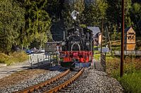 Stoomloc 991568-7 van de Pressnitztalbahn komt binnen op station Schmalzgrube in het Ertsgebergte.
