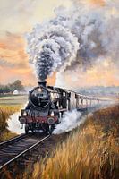 Dampende wolken stijgen op naar de hemel terwijl de indrukwekkende stoomlocomotief krachtig over het spoor raast. Gouden korenaren wiegen zachtjes in de wind, omlijst door een zachte zonsondergang die het tafereel in warm licht baadt. Een nostalgisch gevoel van reizen en ontdekken zweeft door de lucht terwijl het verleden tot leven komt.