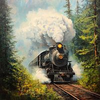 De stoomlocomotief doorbreekt de stilte van het bos met een krachtige fluit, terwijl dichte, groene bomen op de achtergrond leunen. Witte stoomwolken schieten de blauwe lucht in terwijl de trein majestueus over het spoor raast. Een gevoel van avontuur en nostalgie vult de lucht terwijl het spoor in de verte loopt.