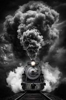 Te midden van de dramatische wolkenformaties breekt een imposante stoomlocomotief door de sombere stilte. De schittering van de voorlamp schijnt door de dichte rookwolk, terwijl enorme stoomkolommen de lucht in schieten. Op de rails lijkt het een oude reus die de tijd is vergeten, klaar om de uitbarstende energie met een krachtig gebrul los te laten.