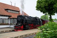Stoomlocomotief van de Brockenbahn in het station van de stad Wernigerode aan de rand van het Harz National Park in Duitsland. Toeristen uit de hele wereld maken gebruik van de historische Brockenbahn om naar de top van de Brocken te reizen.