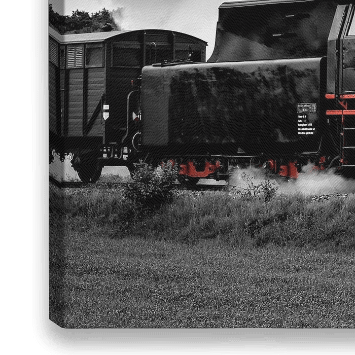 Oude stoomlocomotief rijdend op het lijntje tussen Apeldoorn en Dieren. De oude stoomtreinen worden in stand gehouden door de Veluwsche Stoomtrein Maatschappij. Foto in zwart wit met selectieve kleur rood.