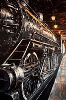 Een majestueuze kolos uit het tijdperk van de stoommachines, glanzend en vol verhalen, staat hier in een glinsterend licht. De glanzende metalen oppervlakken weerspiegelen het warme licht van de omgeving, terwijl de krachtige wielen klaar lijken om weer op gang te komen. De kamer ademt een sfeer van nostalgie en avontuur, waar verleden en heden elkaar ontmoeten.