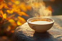 Zachte golven van stoom stijgen verleidelijk op uit een delicate kom, gehuld in warme herfsttinten. Dit harmonieuze tafereel straalt rust en gezelligheid uit, ideaal om je in terug te trekken in de keuken of woonkamer. Een perfecte blikvanger die een gevoel van ontspanning en genot uitstraalt.