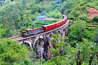 Engelse / Britse architectuur van de oude Nine Arch Bridge (brug), Sri Lanka. Nostalgische treinrit met een stoomlocomotief. De trein rijdt over een spoorrails door bergen, oerwoud, jungle en…
