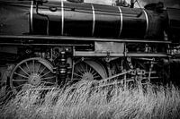 Stoomtreinwielen close up met de ketel en wielen achter het hoge gras langs de spoorlijn. Zwart-wit foto.