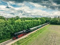 Stoomtrein die op het platteland rijdt tijdens een lentedag met wolken erboven, van bovenaf gezien. De zwarte en rode locomotief trekt passagierstreinwagon met toeristen.