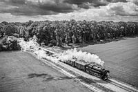Stoomtrein met rook van de locomotief rijdend op het platteland met rook uit de schoorsteen. De zwart-rode locomotief trekt een passagierswagon met toeristen. Zwart-wit foto met nostalgische vintage uitstraling.