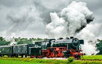 Stoomtrein op het platteland met dikke rookwolken uit locomotief van de Veluwsche Stoomtrein Maatschappij op het spoor tussen Apeldoorn en Dieren.
