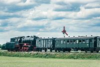 Stoomtrein met rook van de locomotief rijdend op het platteland. De zwarte en rode locomotief trekt passagierswagon met toeristen.
