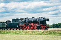 Stoomtrein rijdt op het platteland met rook uit de schoorsteen. De zwarte en rode locomotief trekt een passagierswagon met toeristen.