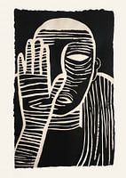 Een abstracte poster van een man die een hand ophoudt als stopteken.