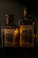 Stilleven met stopflessen bedoeld voor kruiden. Mooie amberkleurige tint.