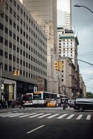 Kruispunt in New York, mensen die op het laatste moment oversteken, taxi's opzoek naar passagiers, een Uber en een fietstaxi. Allemaal proberen ze door het verkeer te komen wat vaker stilstaat dan dat het rijdt.