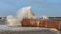 De golven beuken met geweld tegen de golfbrekers aan van de Buitenhaven van Scheveningen.