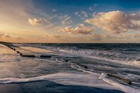 Storm in combinatie met springtij jaagt de golven op de Westerschelde met kracht de Panoramaweg op in Breskens, Zeeuws-Vlaanderen. De foto is gemaakt op het einde van de dag met prachtig warm licht.