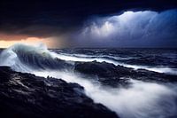 Hyperrealistisch kunstwerk van de woeste zee die tegen de rotsen slaat, met daarboven een dramatisch wolkendek waar de zon met al zijn kracht doorheen probeert te breken.