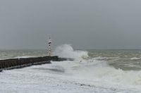Hoge golven bij een golfbreker, tijdens een storm, aan de Zeeuwse kust in Vlissingen.