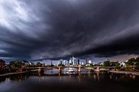 Een ongelooflijke donderwolk beweegt zich over de skyline van Frankfurt als er een schip op de Main nadert. Geweldige kleuren, een ongelooflijke sfeer