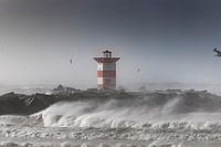 Storm langs de kust van Scheveningen waarbij de hoge golven over het Noordelijk havenhoofd slaan