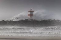 Storm langs de kust van Scheveningen waarbij de hoge golven over het Noordelijk havenhoofd slaan