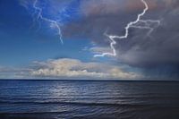Blauwe zee, witte wolken. Een storm steekt op en raast langs de Baltische Zee. Onweerswolken stapelen zich op. Bliksem verlicht de donkere bewolkte hemel. Licht en schaduw op het oppervlak, golven komen omhoog. Zo gaat alles zijn gangetje.