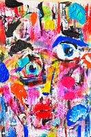Uit dit feest van materialen en gebaren ontstond een abstract gezicht. Niet één gezicht, maar meerdere tegelijk. Ogen verschijnen op verschillende plekken, verschoven en gelaagd, alsof ze allemaal een andere waarheid tonen. De kleuren dansen in contrast en harmonie, soms zacht, soms fel, en dragen bij aan de speelse verwarring van wat je ziet.