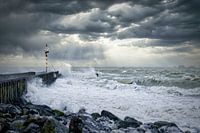 De foto is gemaakt tijdens de storm Ciara vanaf de glooiing richting Westerschelde met zicht op de steiger voor het Keizersbolwerk in Vlissingen (Nederland/Zeeland). Op het moment van de opname was het hoog water.